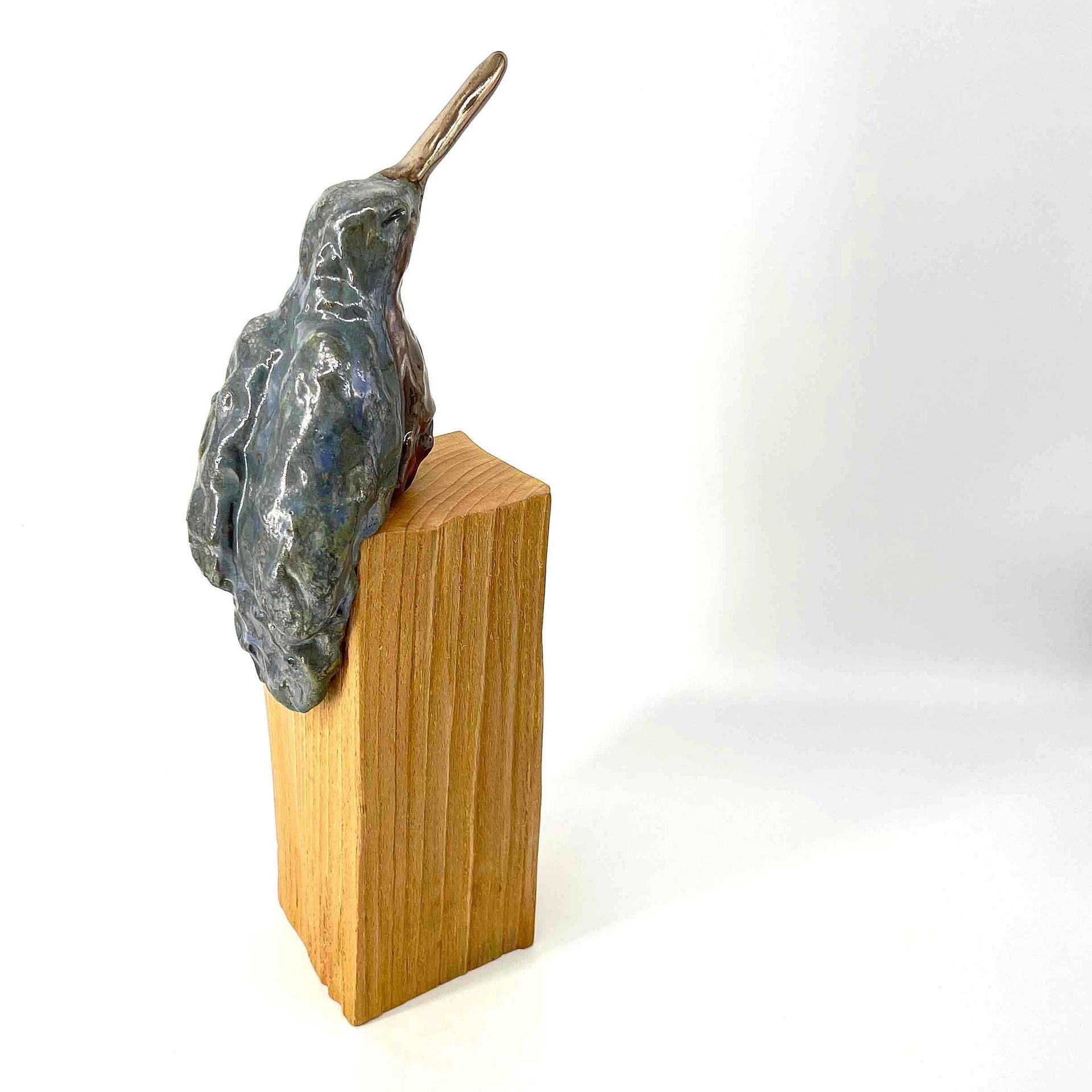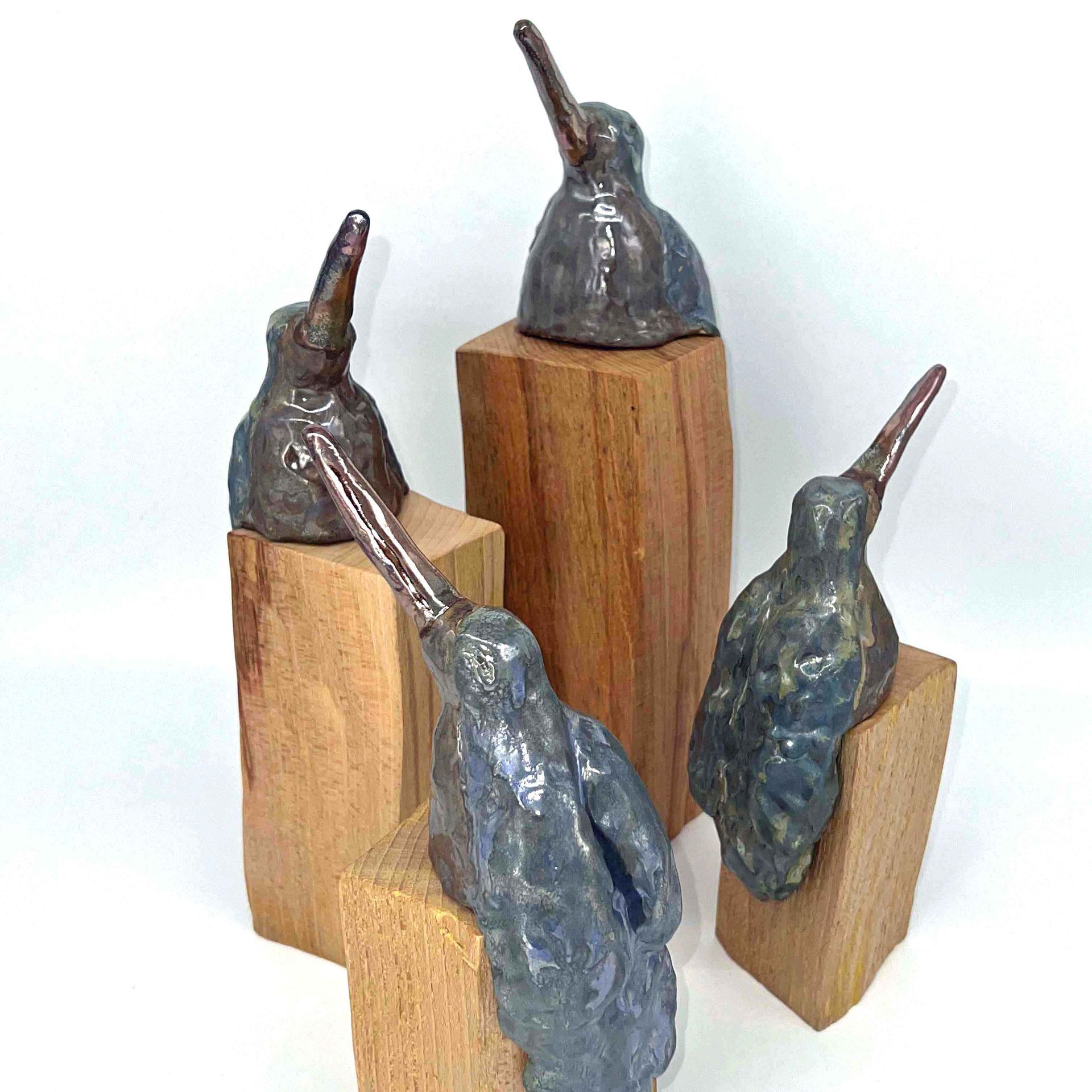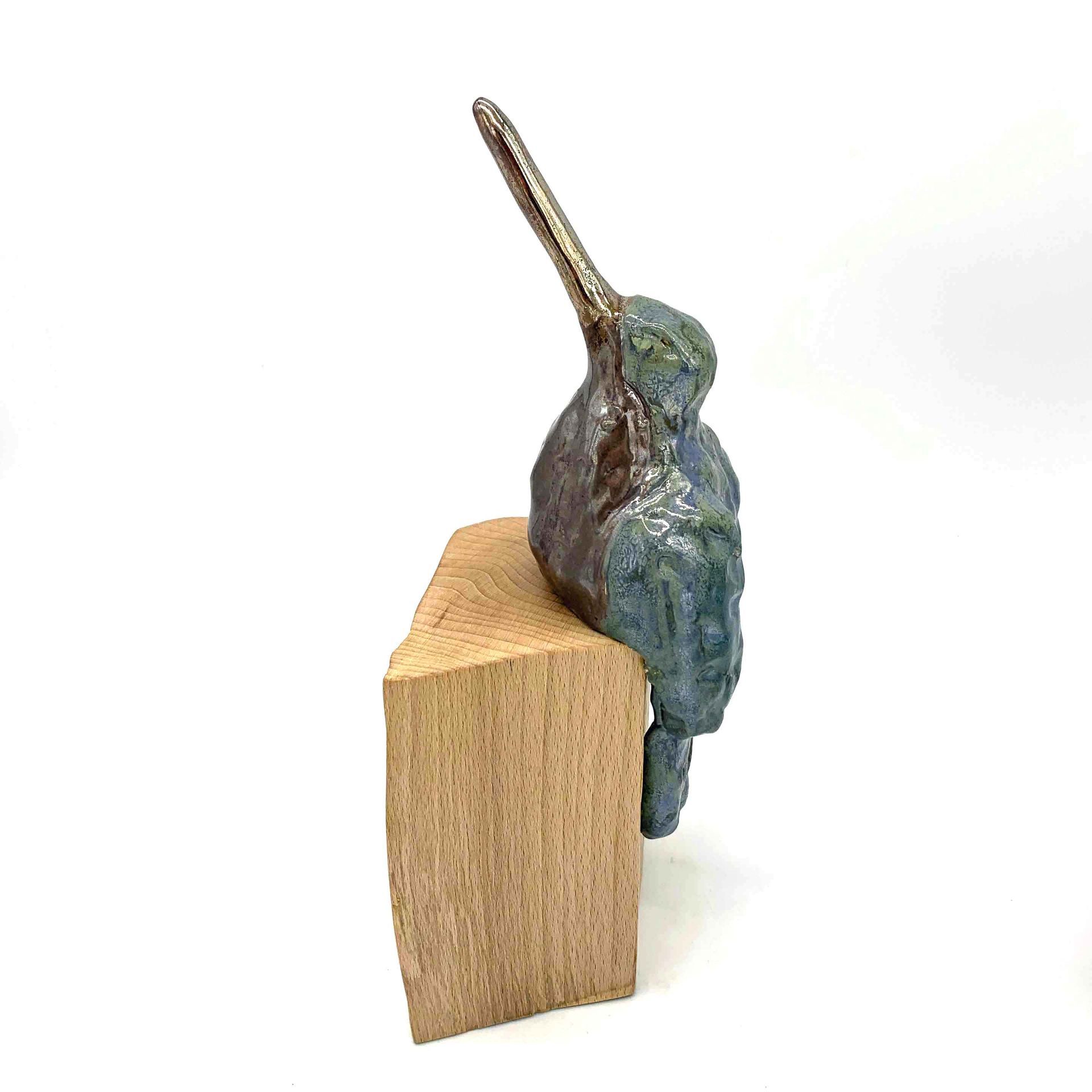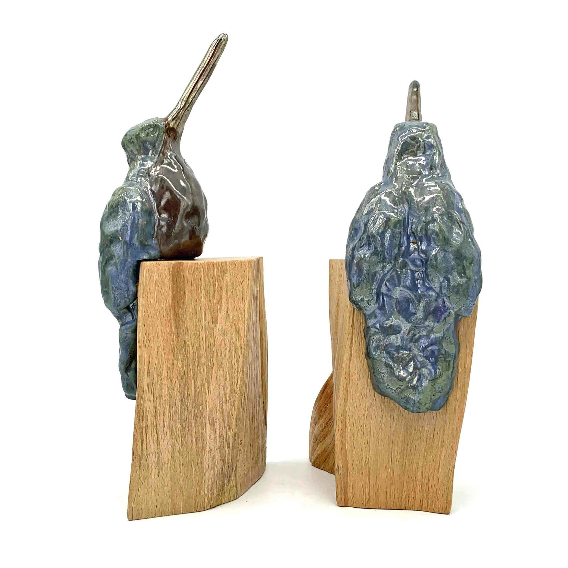 Mooie handgemaakte ijsvogels van keramiek op een eikenhouten sokkel.