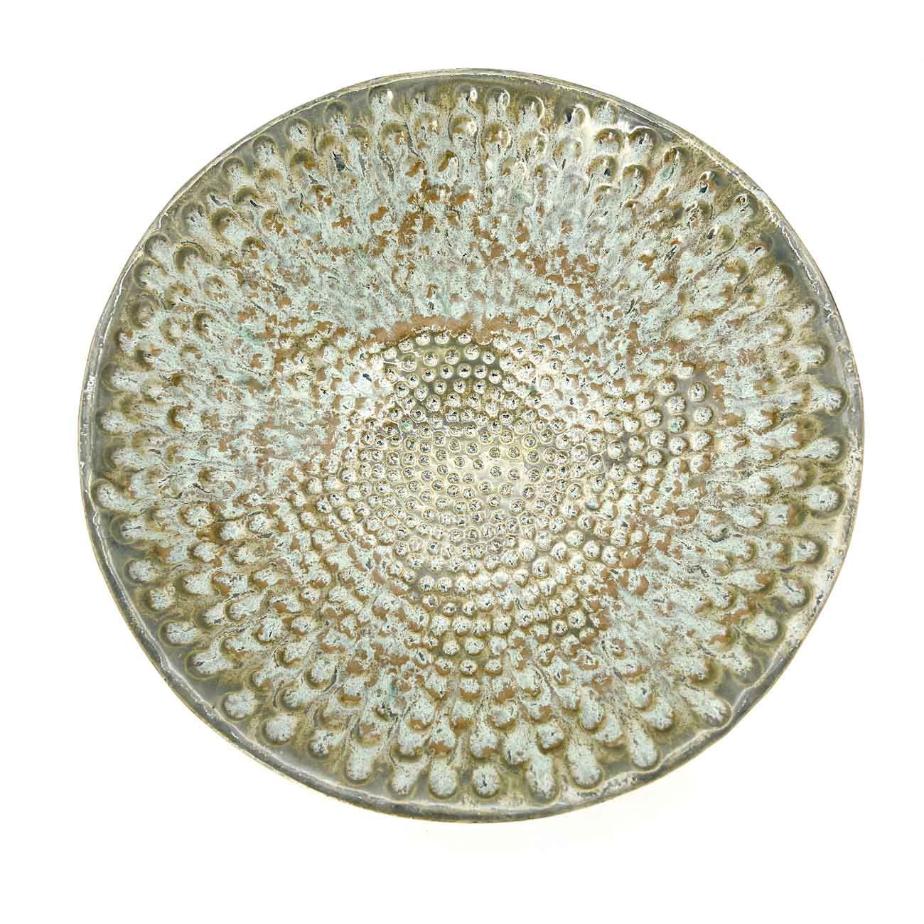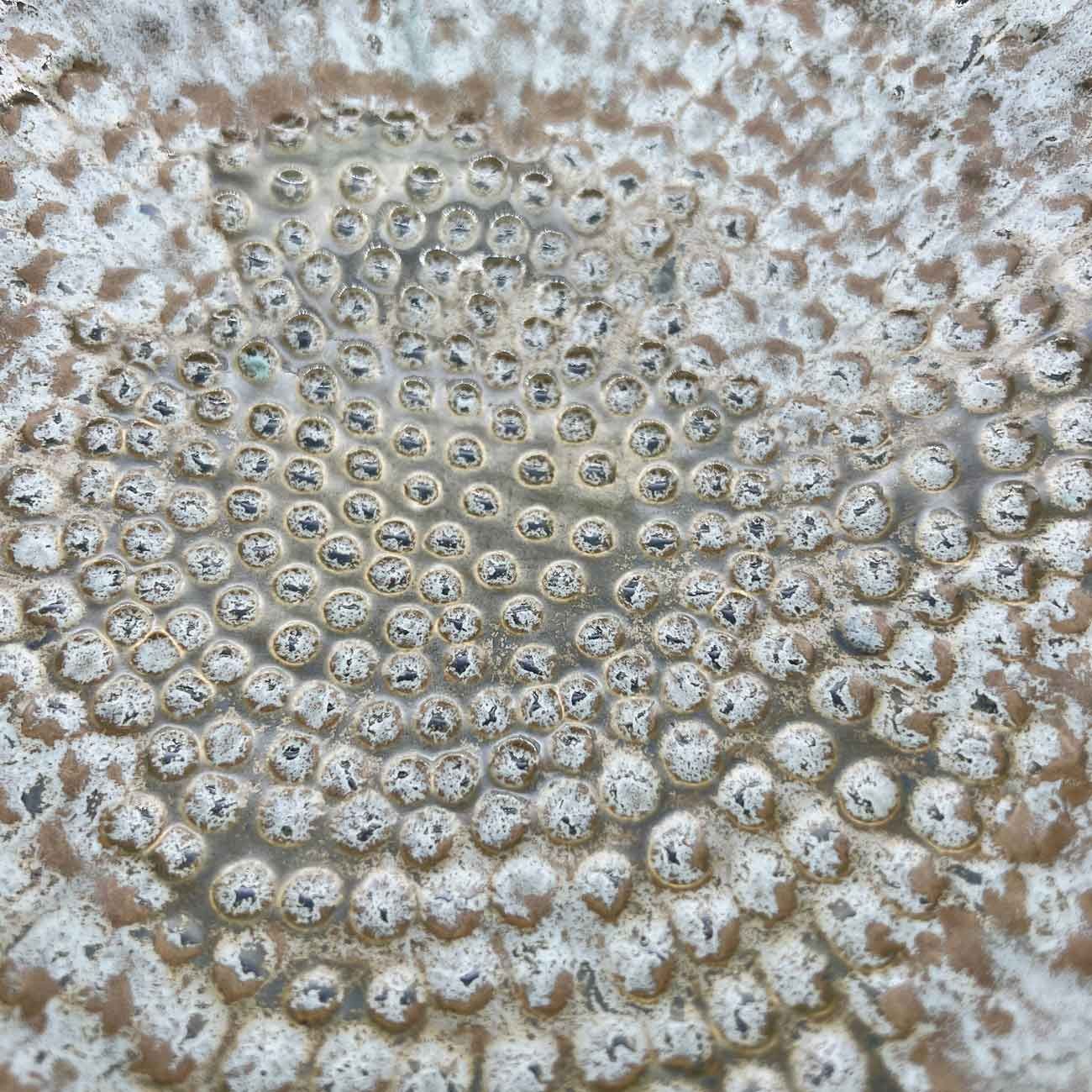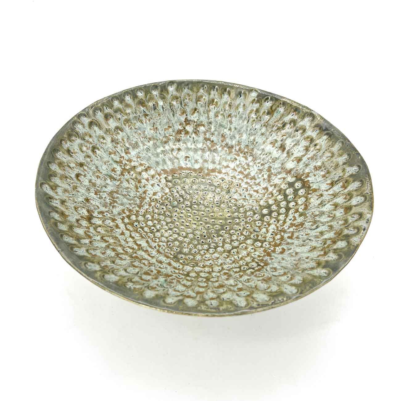 Ontdek de subtiele schoonheid van deze keramische ronde schaal op voet, verfraaid met een uniek deukjesmotief en een mooie glazuur. Deze prachtig vervaardigde schaal voegt een vleugje kunstzinnige gratie toe aan je servies.
